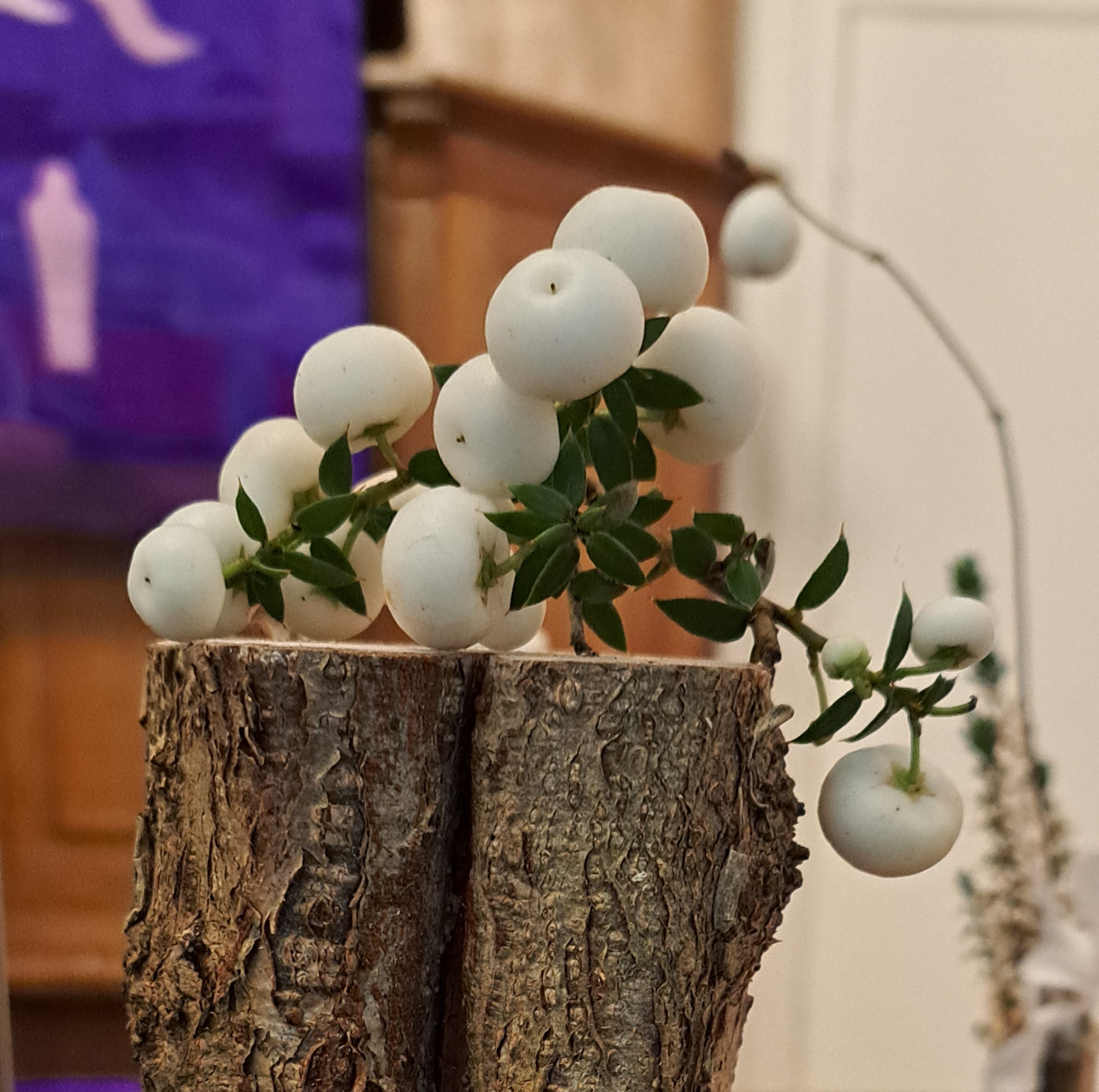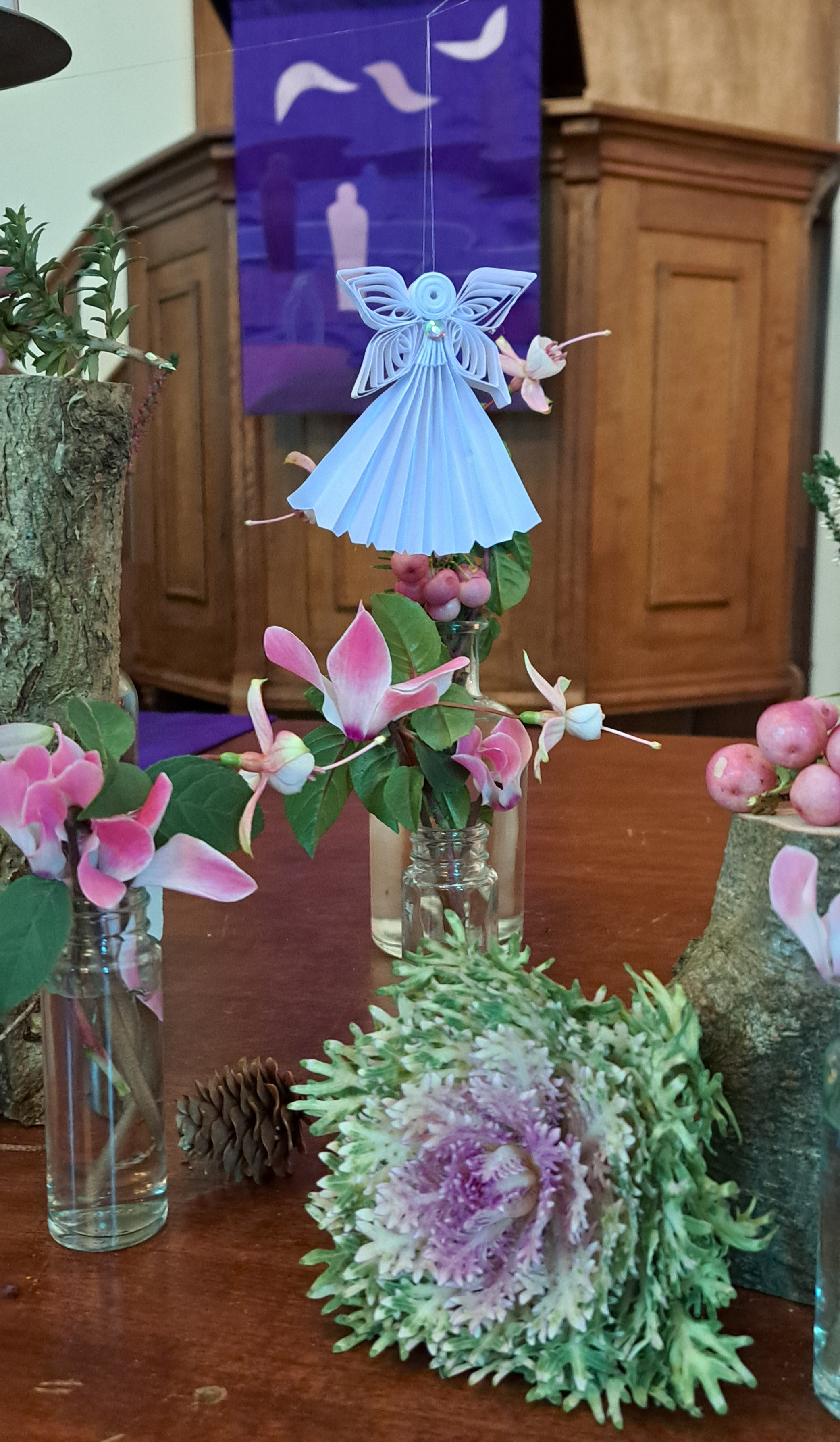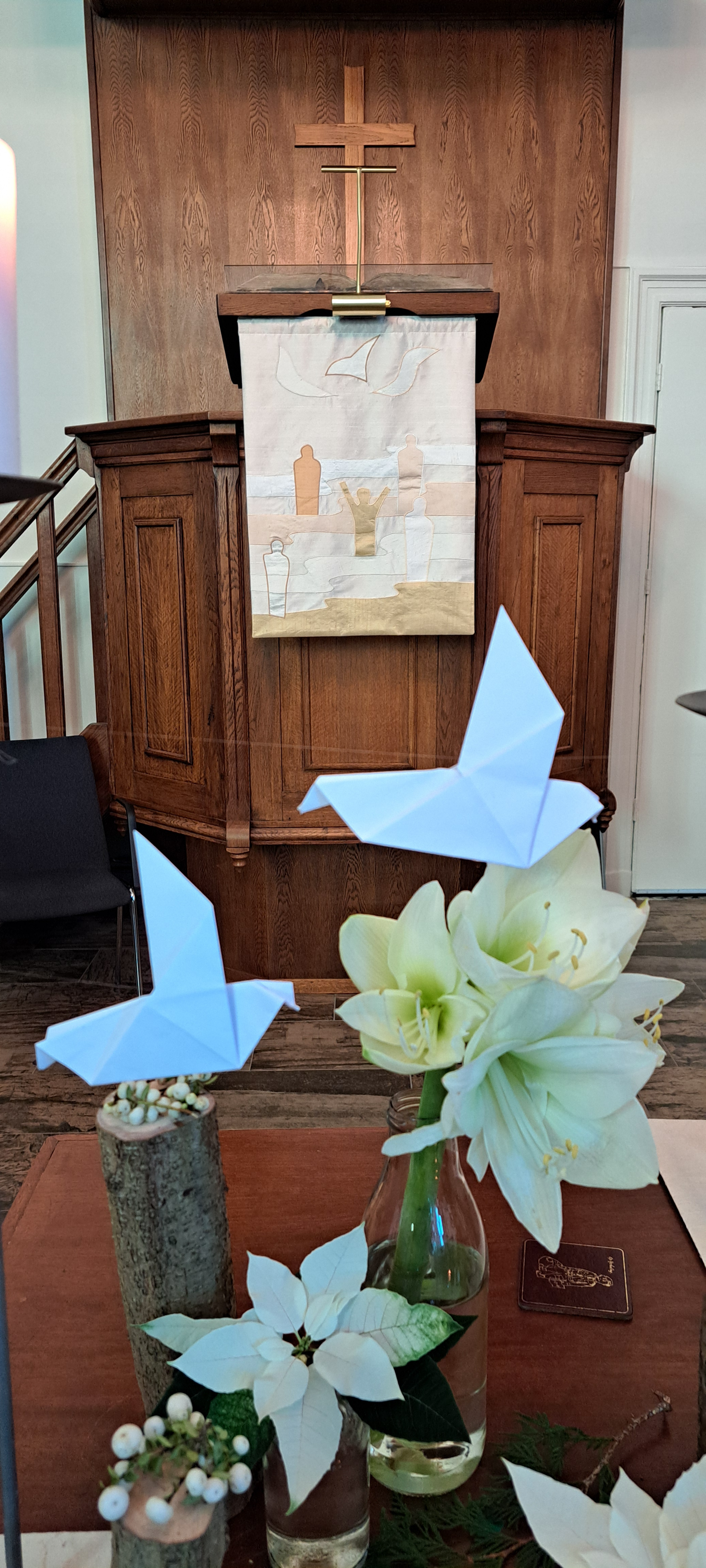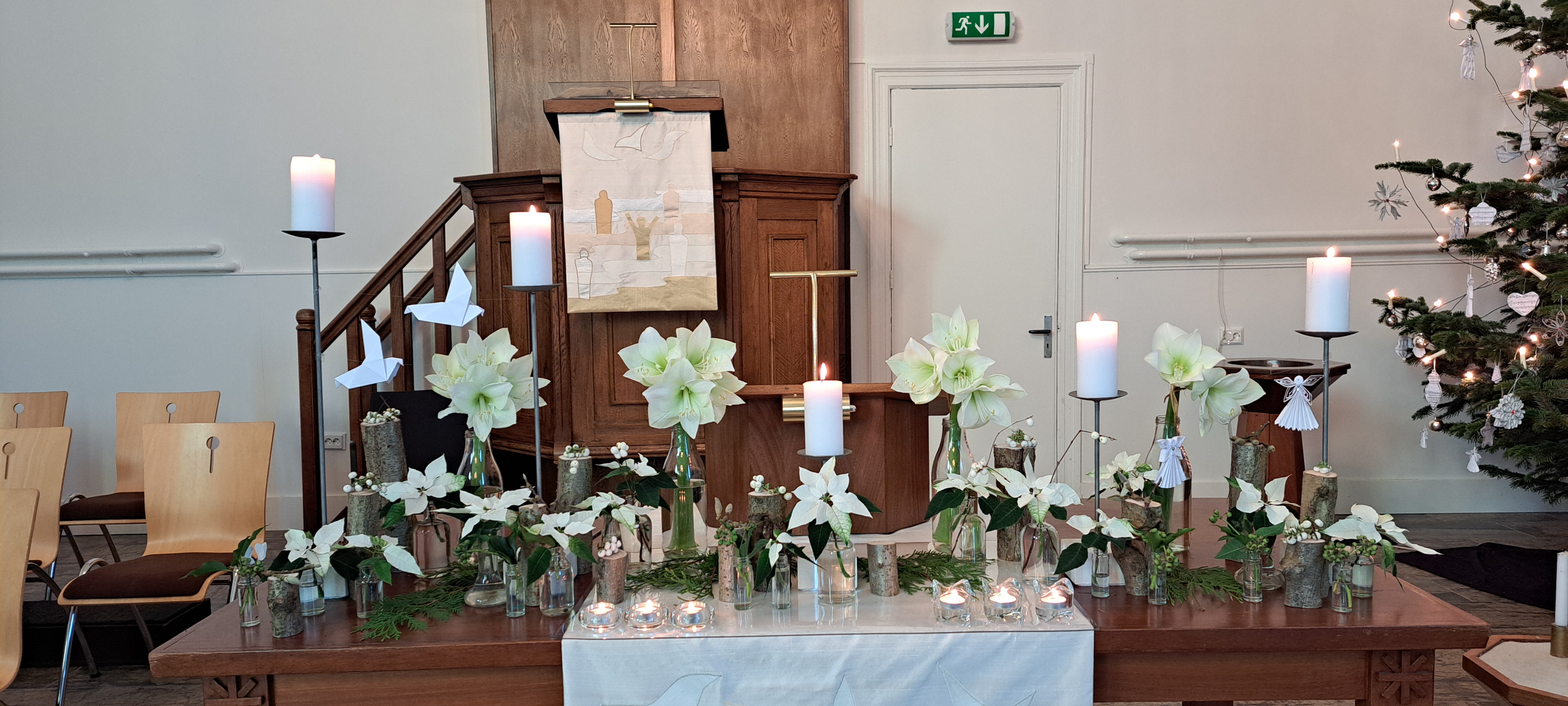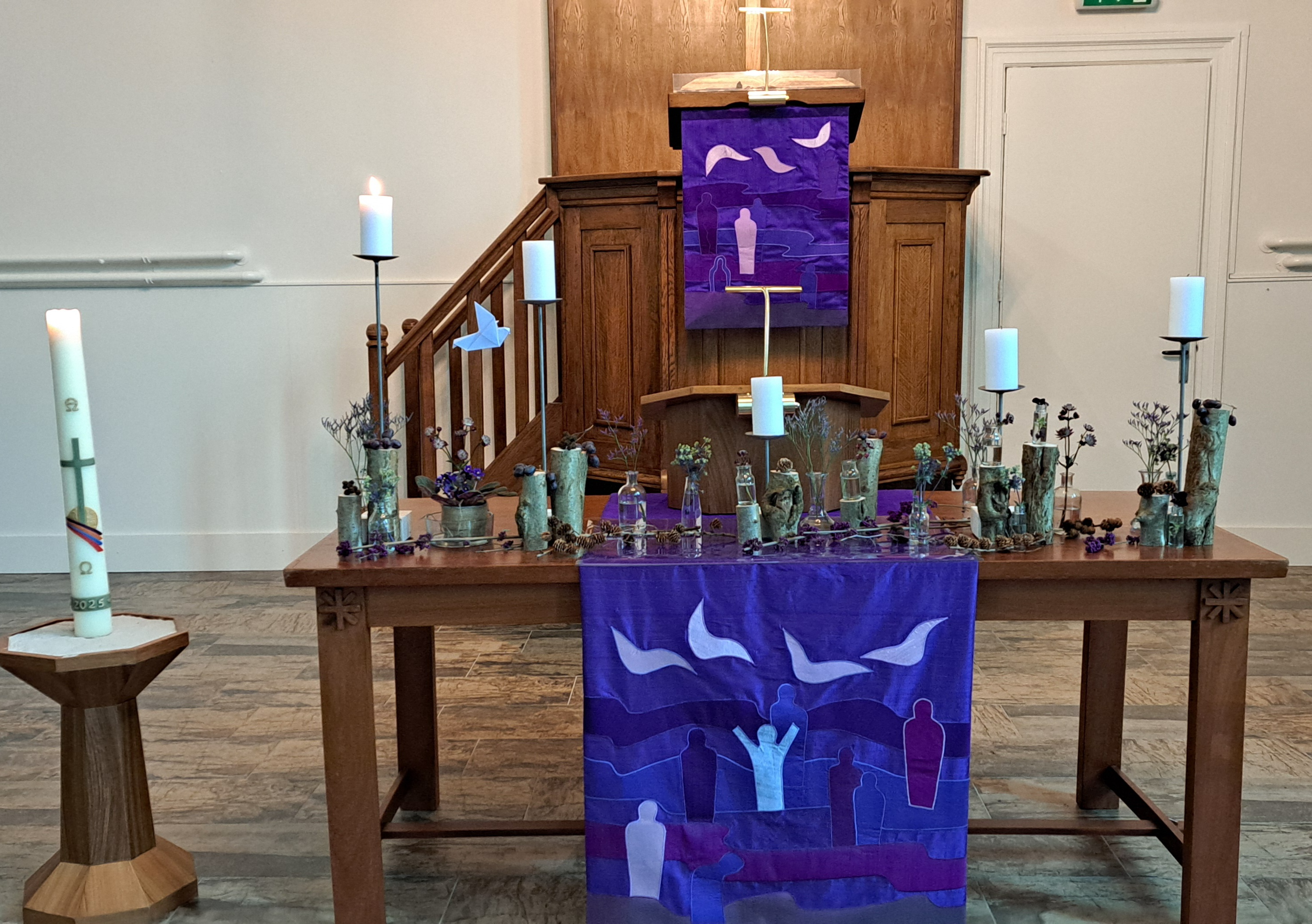 De trouw van God wordt weergeven door de slinger van Hedera die vanaf de paaskaars, over de avondmaalstafel door de schikking loopt en is verbonden met de doopvont.