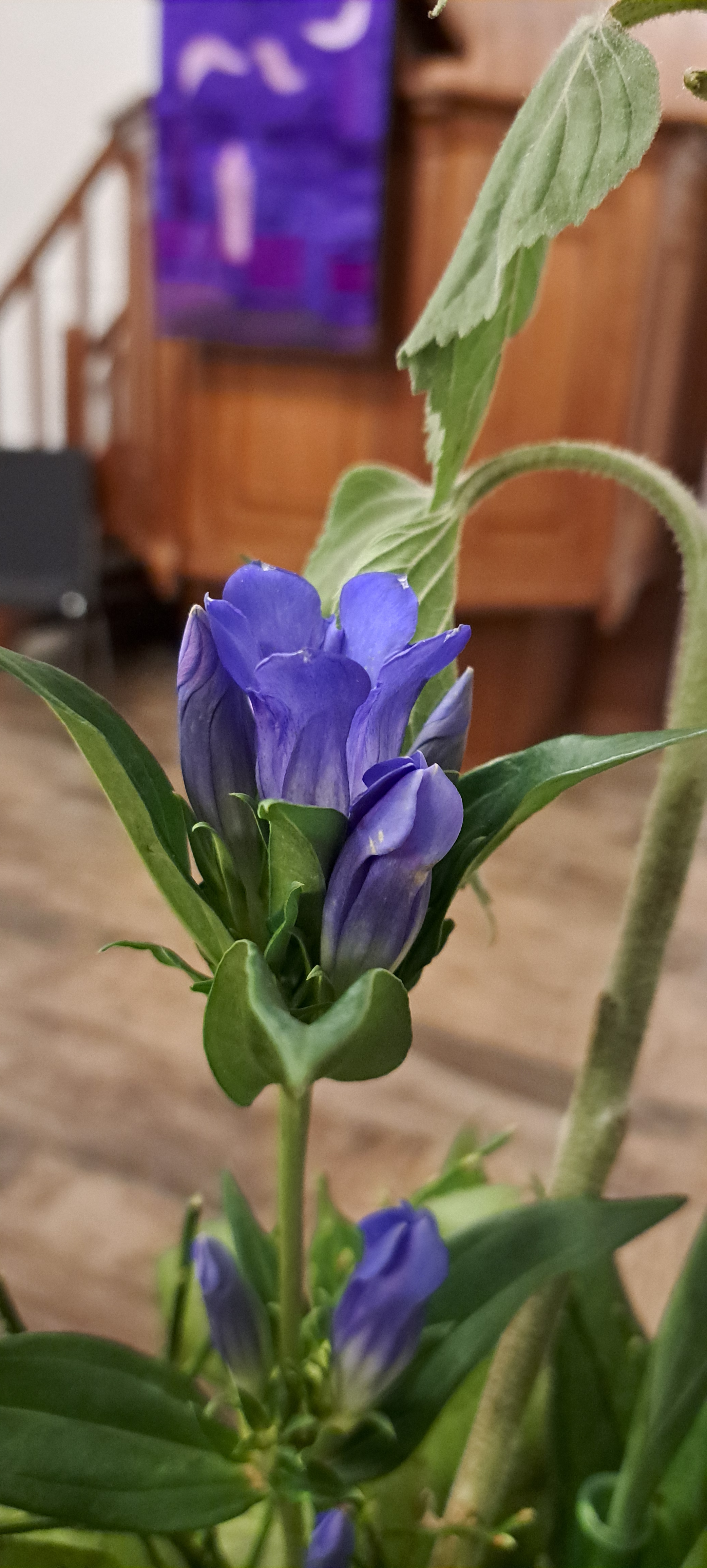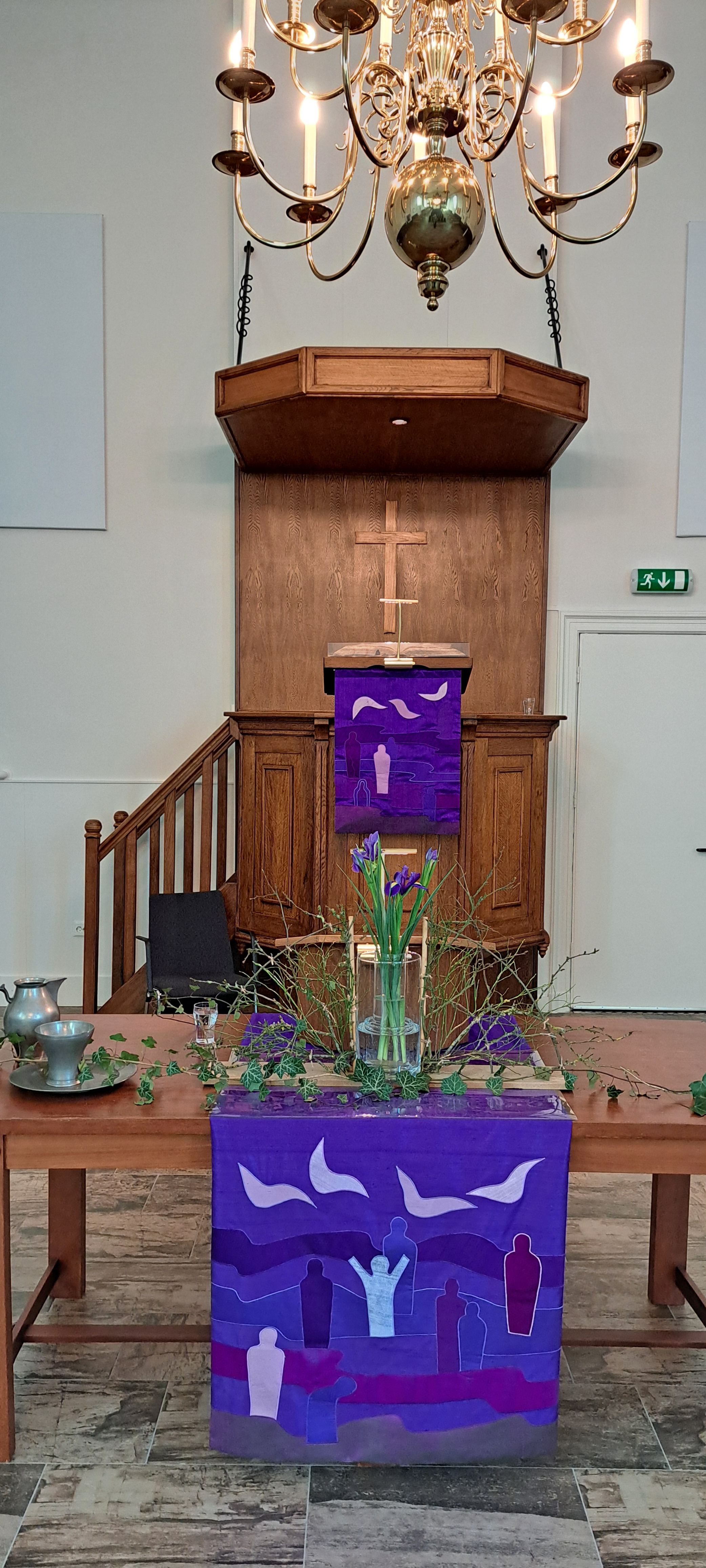 In deze veertigdagentijd, op weg naar Pasen, maken wij tot en met eerste Paasdag een liturgische opbouwschikking in de kerk. Het is vandaag de zesde zondag van de veertigdagentijd. Over de statafel ligt een paars kleed. Daarop een lange lap jute als een weg. Paars en jute staan voor bezinning, rust zoeken, soberheid en inkeer waardoor er bij onszelf iets kan ontstaan van binnenuit. Ons leven is een reis, onderweg kom je van alles tegen, doe je allerlei ervaringen op, met vallen en opstaan zoek je je weg naar de toekomst. De open deur staat achteraan op de tafel en verbeeldt: Onvoorwaardelijke liefde. Onvoorwaardelijke liefde die leven geeft en vreugde brengt. De deur is een verwijzing naar Jezus, een open huis waar het goed is om te wonen. Wij mogen door de deur heen, naar de toekomst. Achter de deur staan zes paarse kaarsen waarvan er iedere zondag één meer mag branden, omdat we dichter bij Pasen komen.
