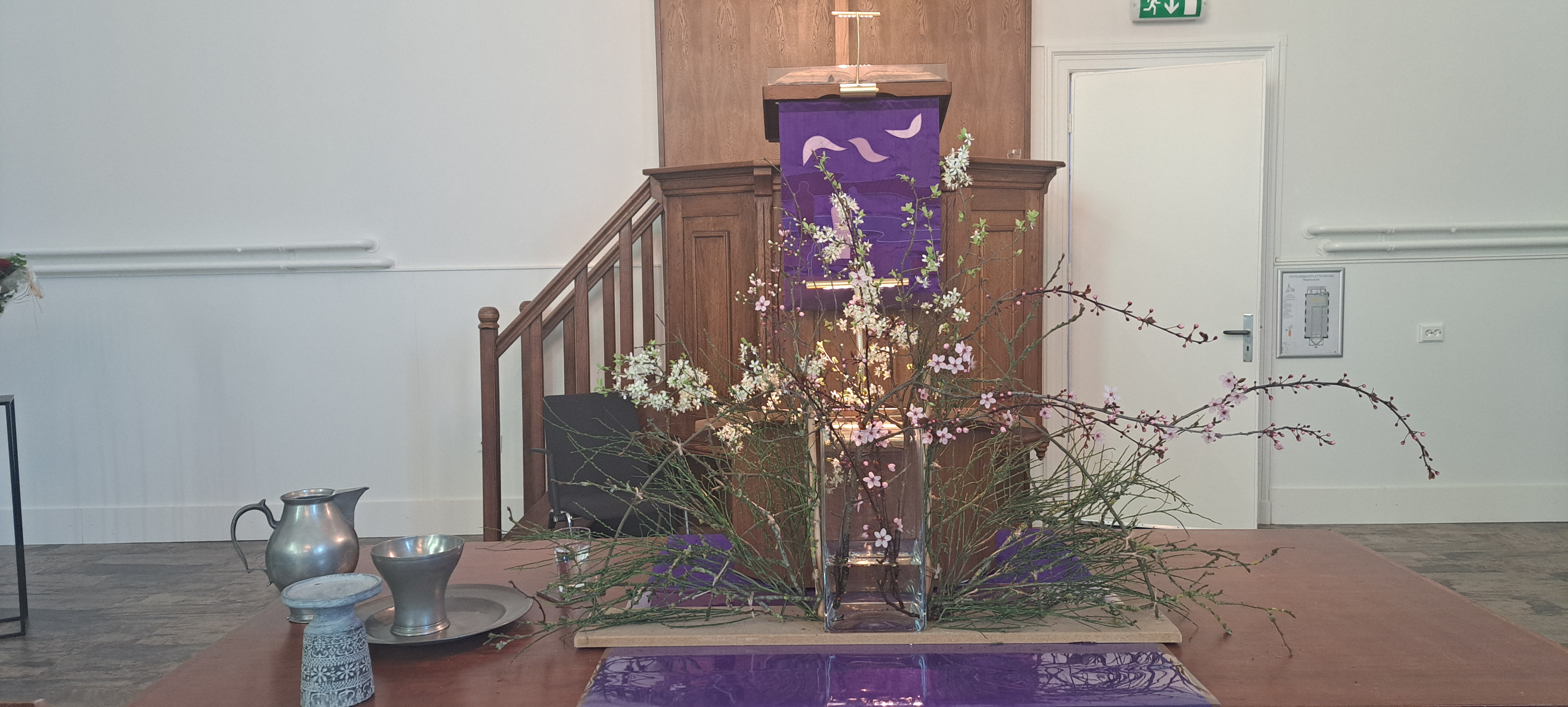In deze veertigdagentijd, op weg naar Pasen, maken wij vanaf deze zondag tot en met 1ePaasdag een liturgische opbouwschikking in de kerk. Het is vandaag de vierde zondag van de veertigdagentijd, zondag Laetare. Verheug U, ook wel de roze zondag genoemd. Over de statafel ligt een paars kleed. Daarop een lange lap jute als een weg. Paars en jute staan voor bezinning, rust zoeken, soberheid en inkeer waardoor er bij onszelf iets kan ontstaan van binnenuit. Ons leven is een reis, onderweg kom je van alles tegen, doe je allerlei ervaringen op, met vallen en opstaan zoek je je weg naar de toekomst. De open deur staat achteraan op de tafel en verbeeldt: Onvoorwaardelijke liefde. Onvoorwaardelijke liefde die leven geeft en vreugde brengt. De deur is een verwijzing naar Jezus, een open huis waar het goed is om te wonen. Wij mogen door de deur heen, naar de toekomst. Achter de deur staan 6 paarse kaarsen waarvan er iedere zondag één meer mag branden, omdat we dichter bij Pasen komen. Op de tafel een roze kaars die al straalt van vreugde, we zien door het donker al een sprankje licht als verwijzing naar het komende Paasfeest. Op de tafel liggen vijf broden, twee vissen en kruimels brood op het pad. Die verwijzen naar het evangelie van Johannes. Jezus leert ons delen, want als wij dit leren, dan zal er genoeg zijn voor iedereen. We delen dan het leven met de ander. De Hedera, die naar de Paaskaars loopt, geeft Gods trouw weer, Hij houdt ons vast.