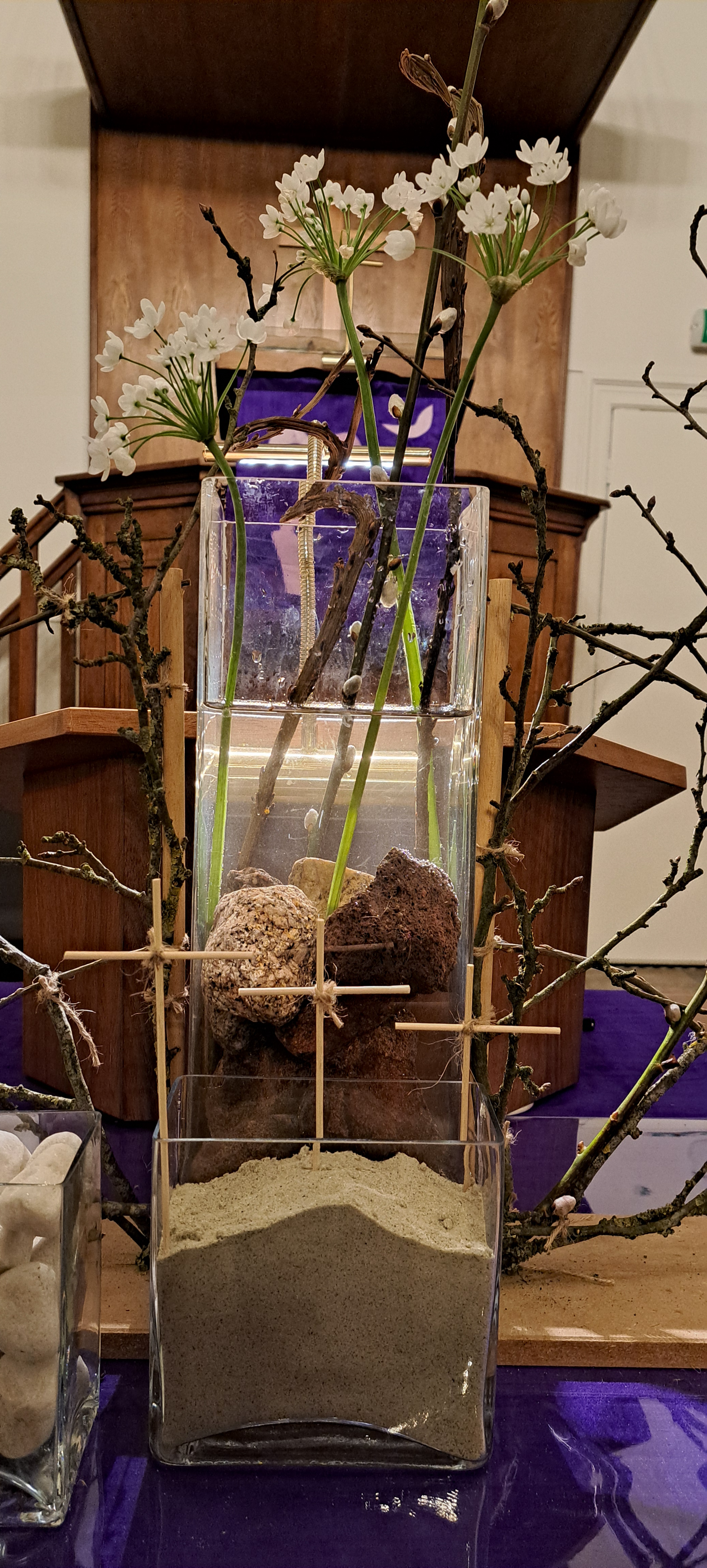 Op iedere windrichting zijn twee takken door de schikking gestoken, de takken steunen op de krans met gipskruid, maar steken hier ook bovenuit. De tak is een verwijzing naar Marcus 3, waarin de discipelen de opdracht krijgen niets mee te nemen, behalve een stok. Een stok is om op te steunen, je kunt er ook dingen mee dragen én je kunt hem gebruiken ter bescherming. Alle gemeenteleden zijn ambtsdragers, maar diakenen en ouderlingen zijn bijzondere ambstdragers, zij zijn geroepen om de gemeente als geheel te laten functioneren en dragen daarmee een extra verantwoordlijkheid. Dit verschil hebben we willen benadrukken door aan elke tak een kleine schikking met bloemen te hangen.