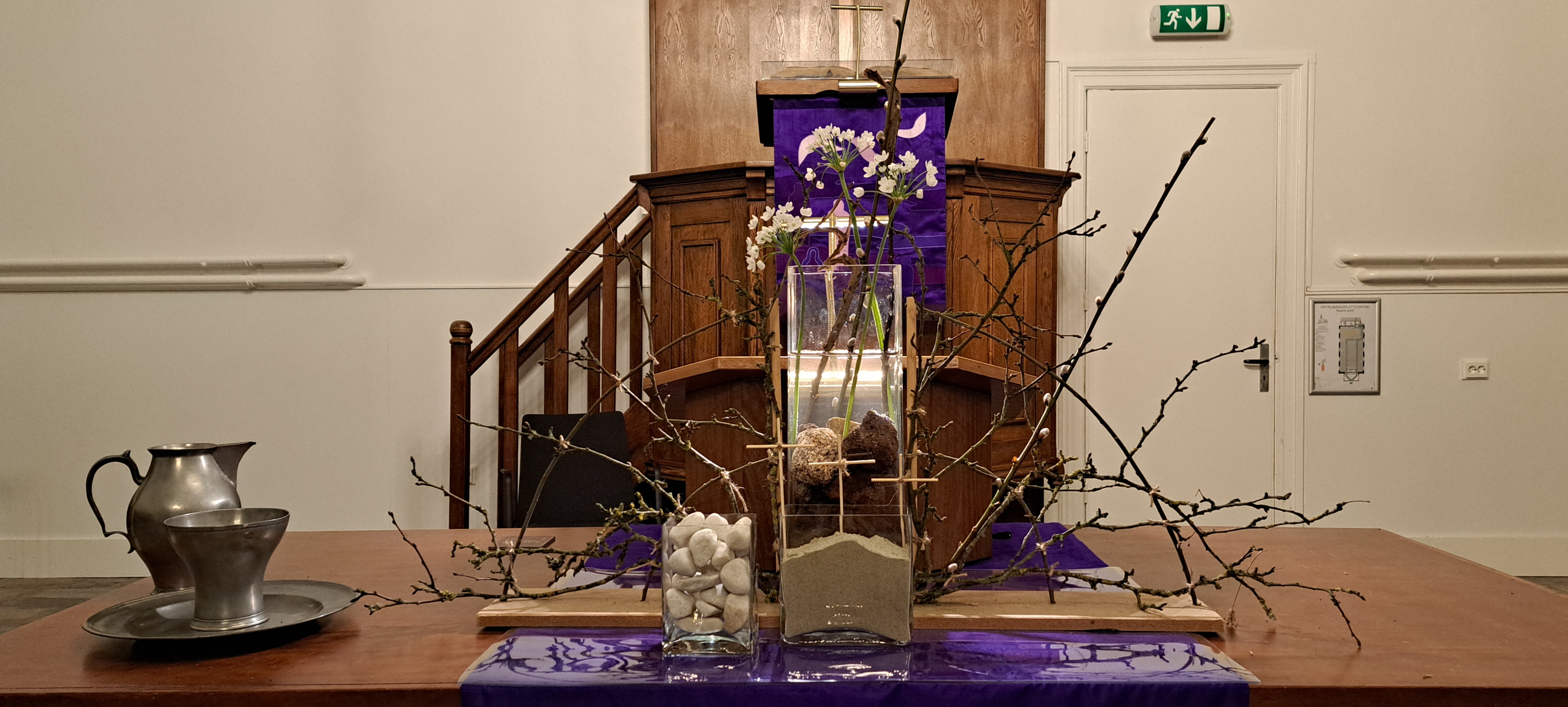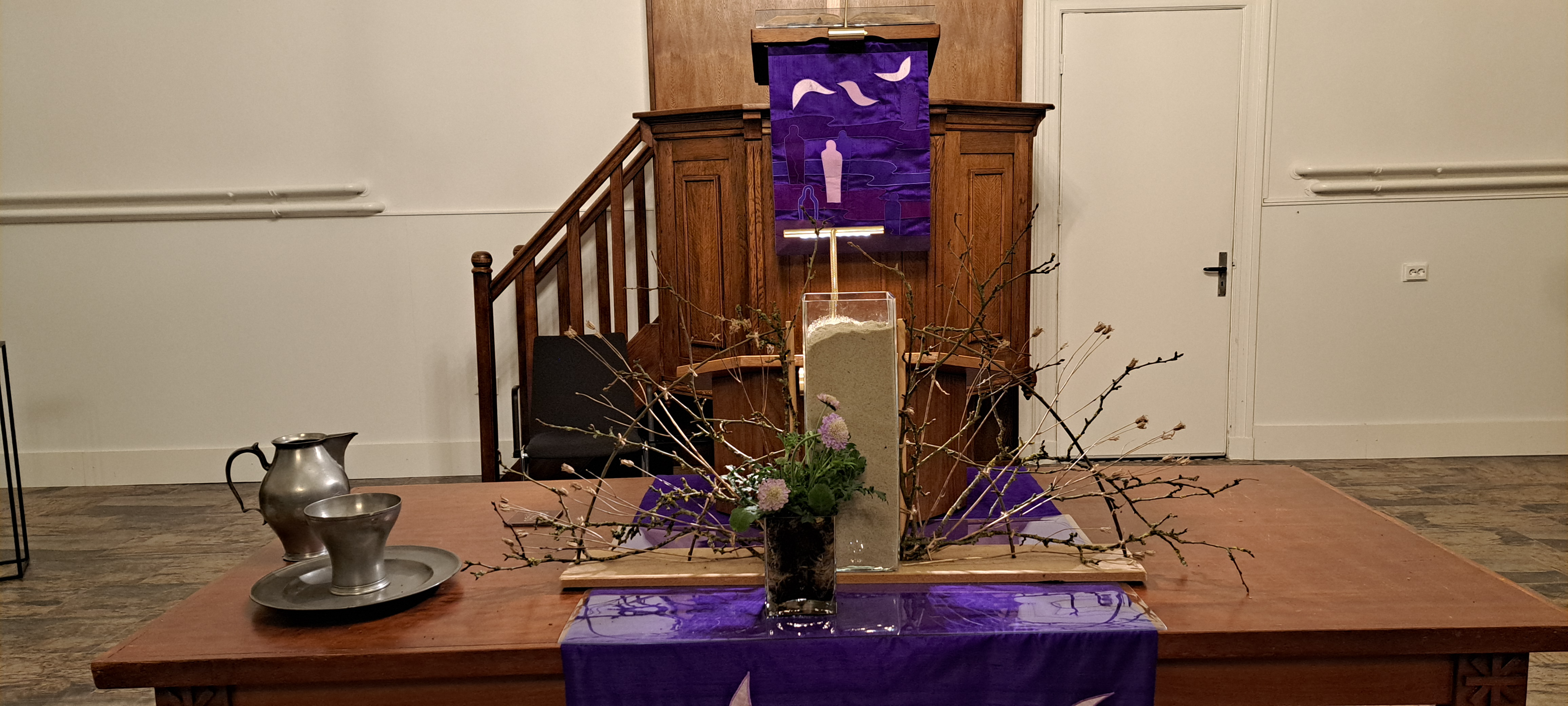 In deze veertigdagentijd, op weg naar Pasen, maken wij tot en met eerste Paasdag een liturgische opbouwschikking in de kerk. Het is vandaag de zesde zondag van de veertigdagentijd. Over de statafel ligt een paars kleed. Daarop een lange lap jute als een weg. Paars en jute staan voor bezinning, rust zoeken, soberheid en inkeer waardoor er bij onszelf iets kan ontstaan van binnenuit. Ons leven is een reis, onderweg kom je van alles tegen, doe je allerlei ervaringen op, met vallen en opstaan zoek je je weg naar de toekomst. De open deur staat achteraan op de tafel en verbeeldt: Onvoorwaardelijke liefde. Onvoorwaardelijke liefde die leven geeft en vreugde brengt. De deur is een verwijzing naar Jezus, een open huis waar het goed is om te wonen. Wij mogen door de deur heen, naar de toekomst. Achter de deur staan zes paarse kaarsen waarvan er iedere zondag één meer mag branden, omdat we dichter bij Pasen komen.