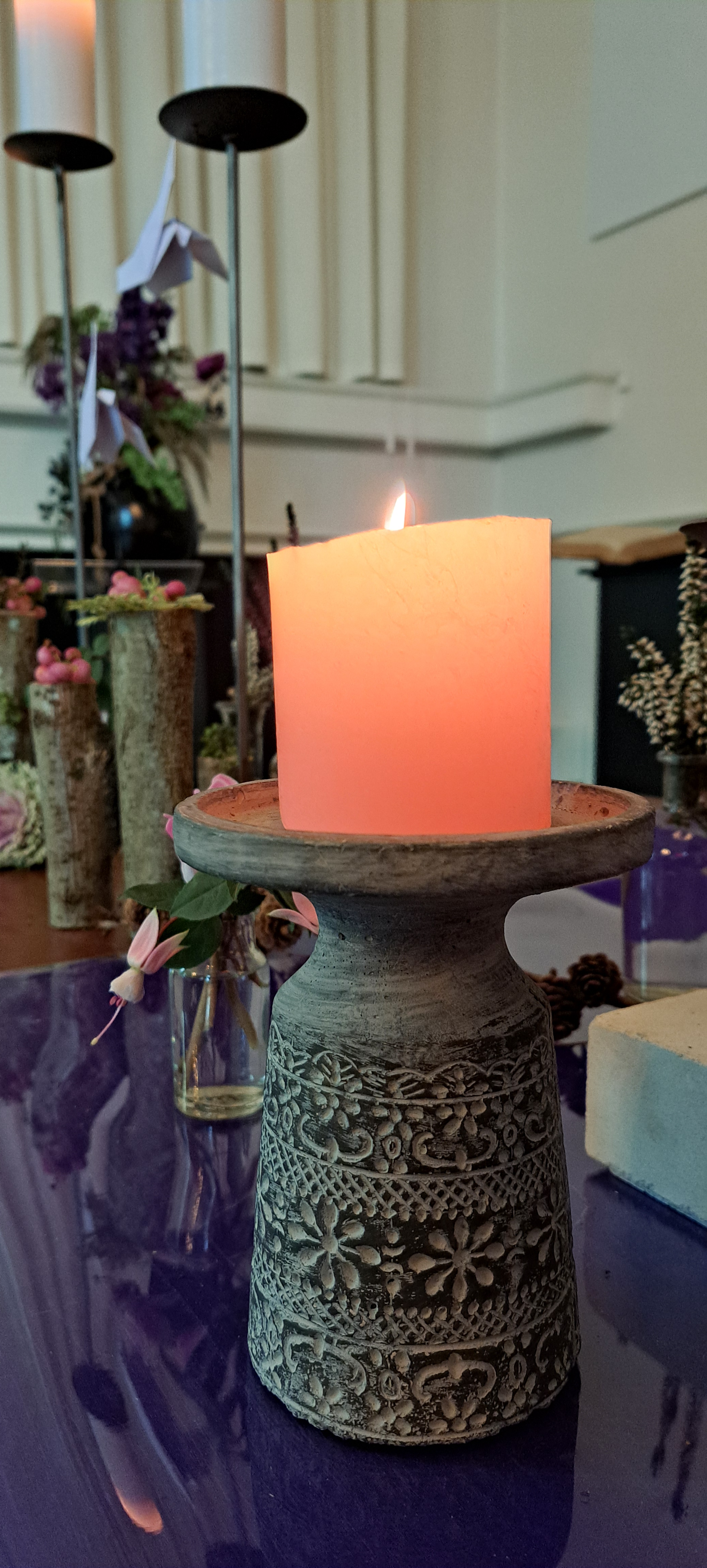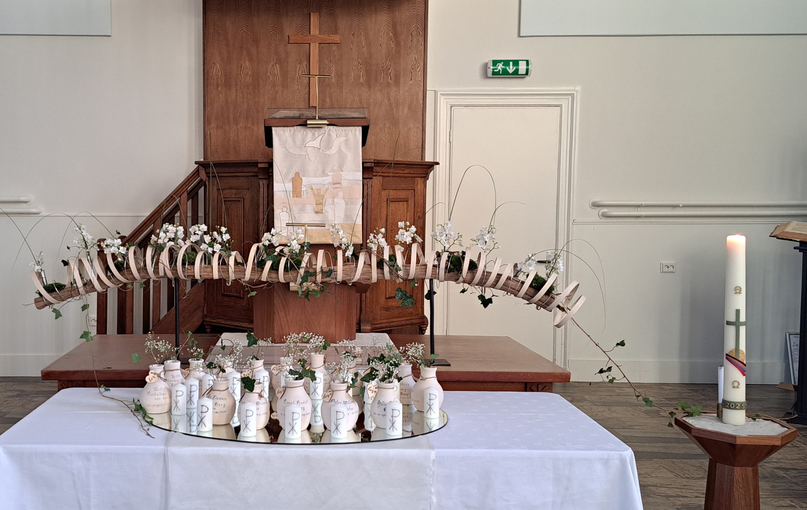 De trouw van God wordt weergeven door de slinger van Hedera die vanaf de paaskaars, over de avondmaalstafel door de schikking loopt en is verbonden met de doopvont.