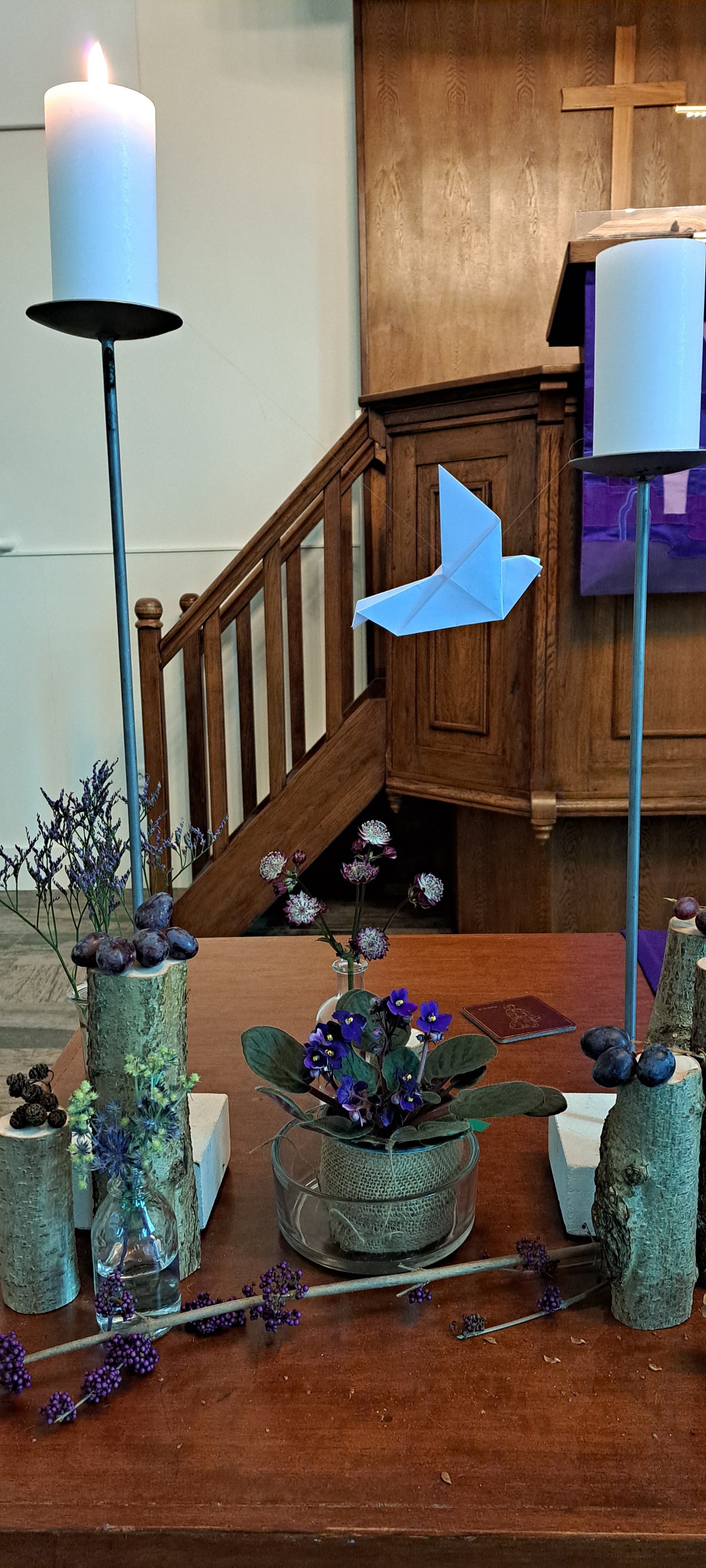 Aan een tak linksboven in de schikking bevindt zich een kleine bloem van de Scabiosa of het Duifkruid. De bloem lijkt door zijn kleur op de kleur van een duif en verwijst daardoor naar de Heilige Geest. Met een beetje fantasie lijkt het of het Duifkruid vanaf de Paaskaars aan komt zweven. De bloem is onopvallend aanwezig, zoals dat vaak ook is met de werking van de Heilige Geest.