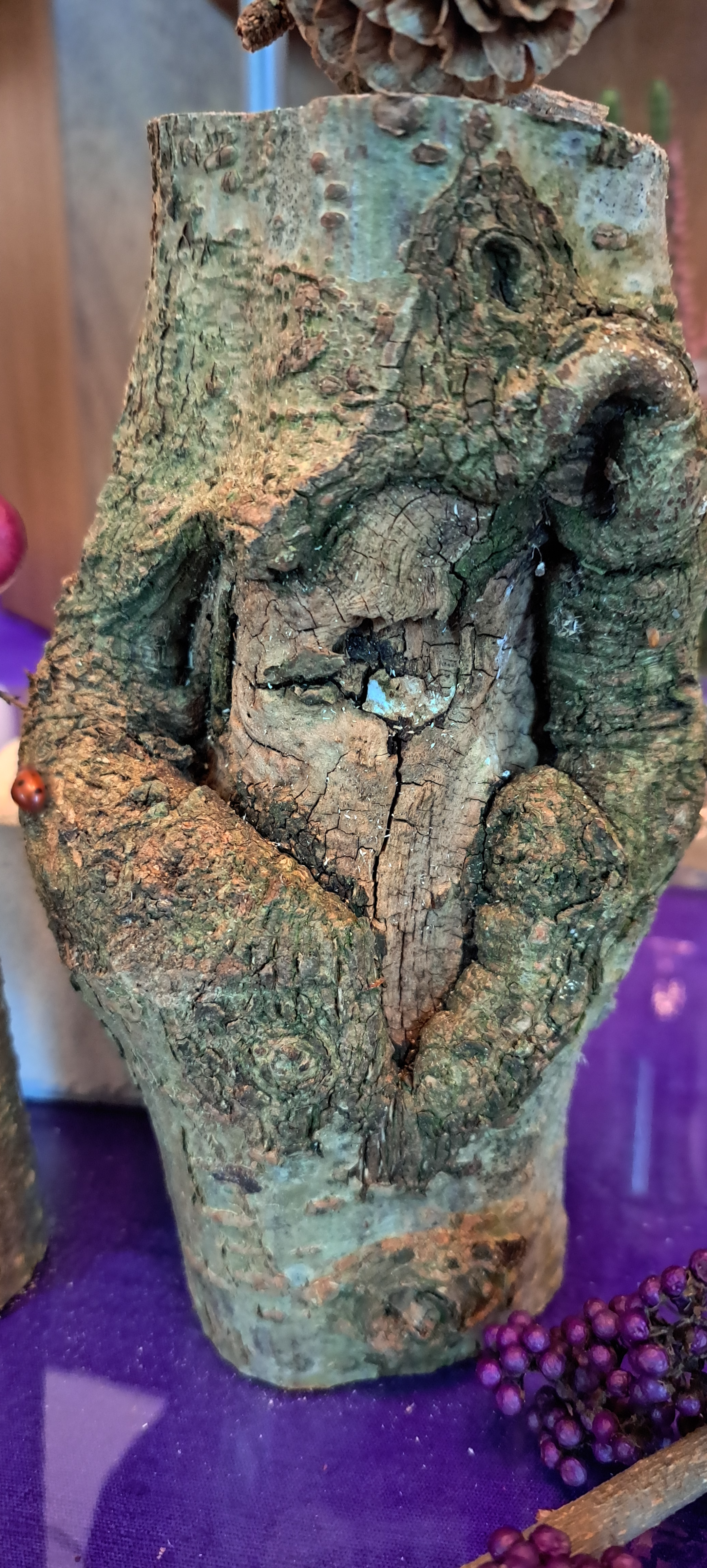 Daarachter de boomstronk, die oprijst als een berg. De berg is vaak een plek waar Jezus zich terugtrekt of juist heen gaat om God te ontmoeten. De boomstronk is bedekt met mos, het symbolische gras waar de menigte op plaats nam.