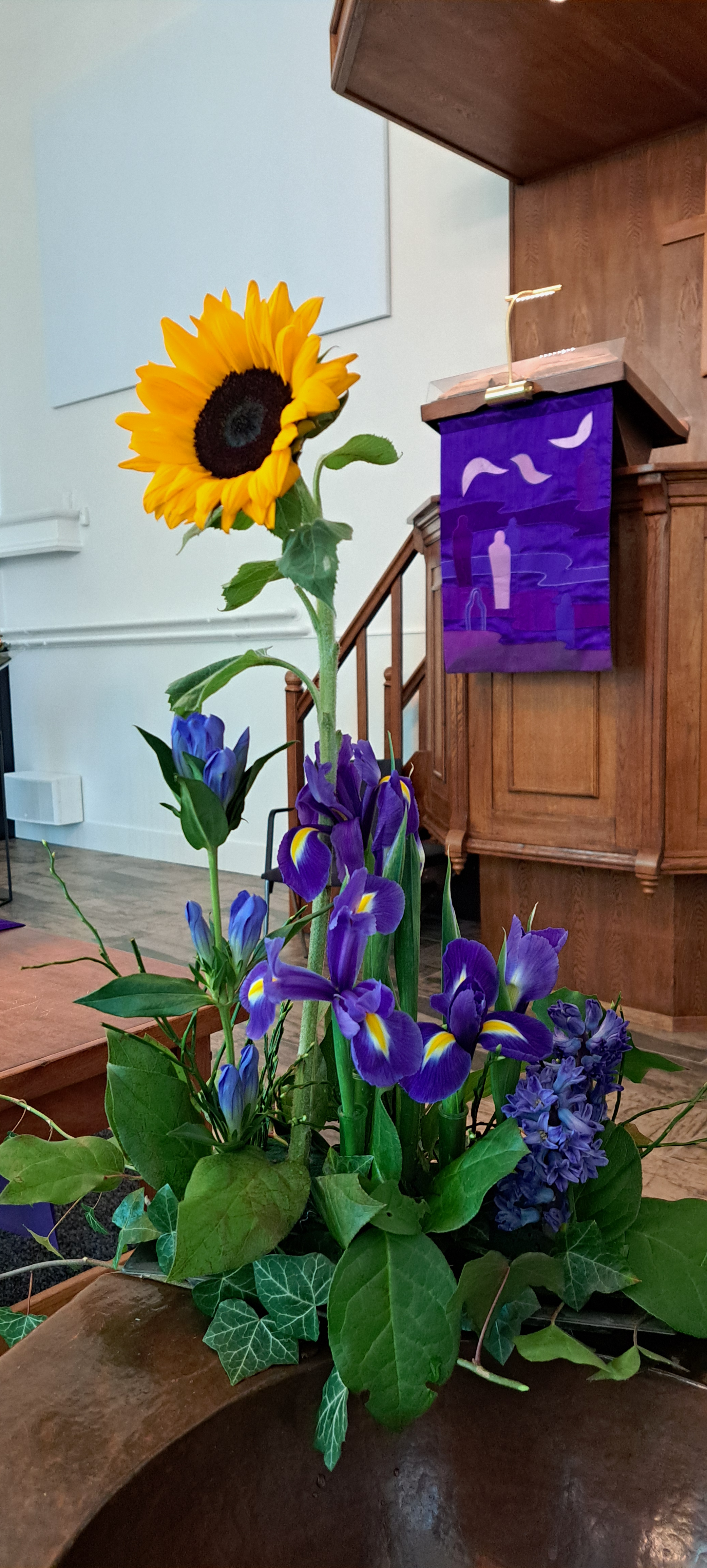 Vandaag vieren het Pinksterfeest. We zijn heel blij dat we vandaag weer met een aantal gemeenteleden deze dienst mogen beleven. Daarom hebben we ook een schikking gemaakt naast het kruis in het voorportaal. De kleuren van de bloemen die we daar hebben verwerkt komen overeen met de bloemen van de schikking.