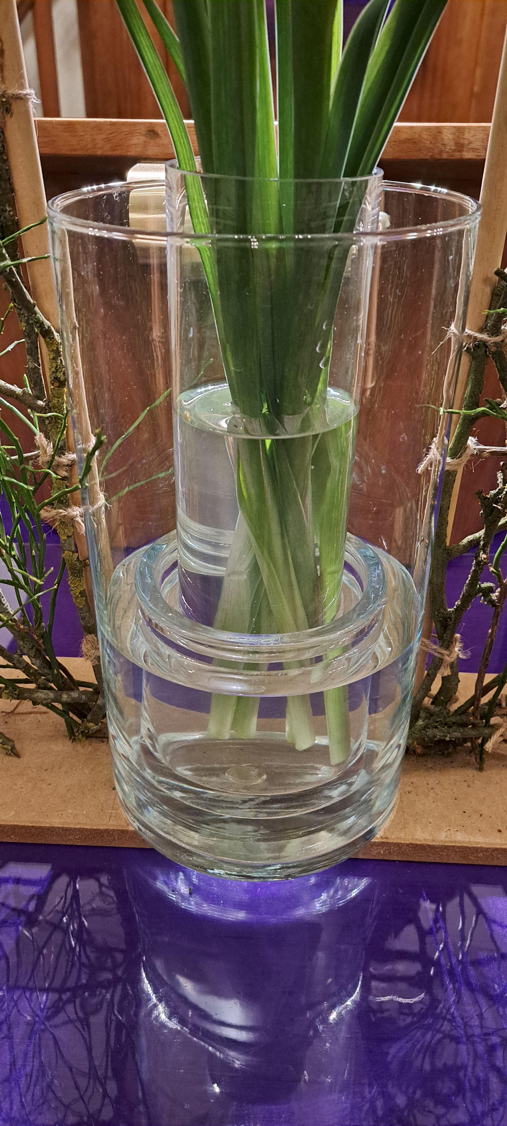 De flessen zijn gevuld met allerlei takken en voorjaarsbloeiers, als symbool voor het nieuwe leven. Vanaf de Paaskaars slingert de Hedera naar de schikking, als teken van Gods trouw.