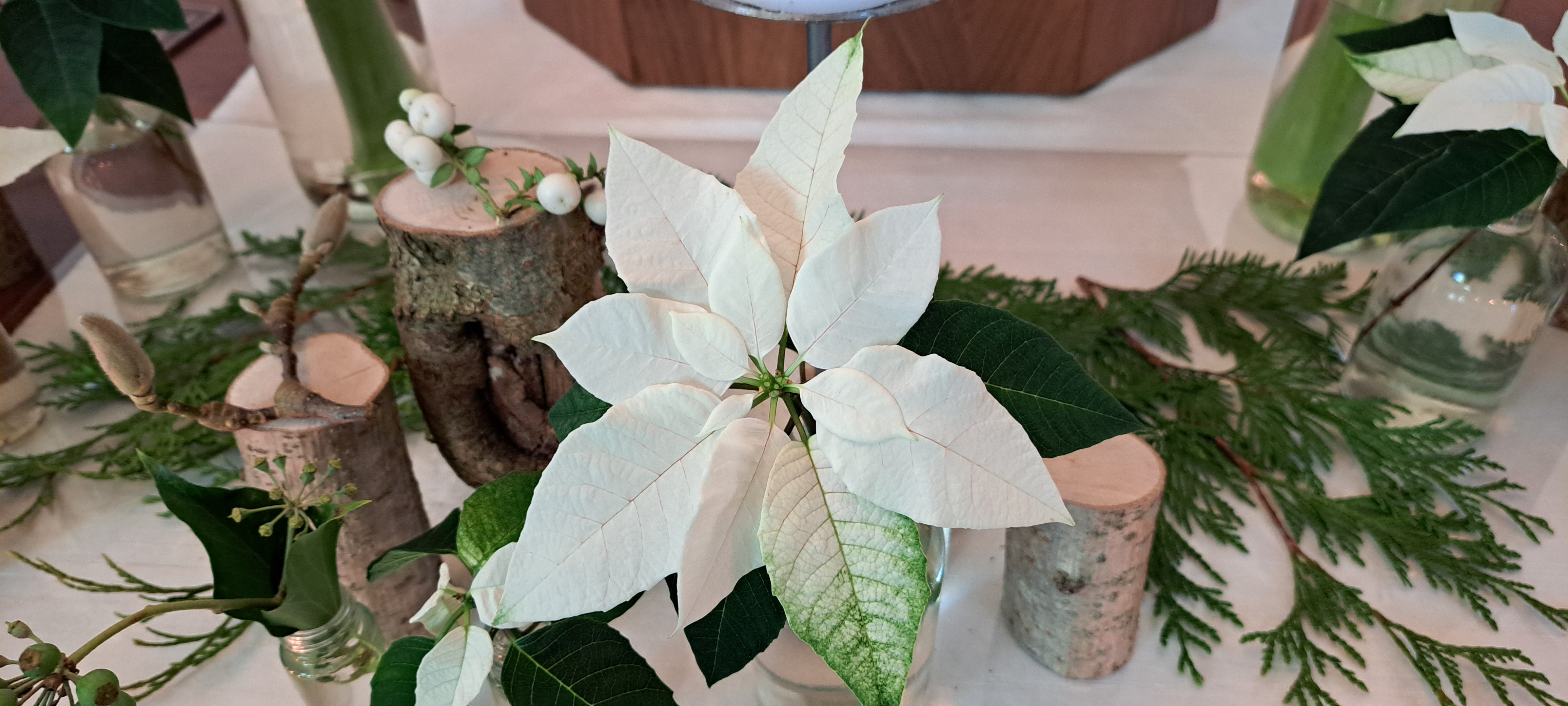 Alle schalen zijn nu onderling met elkaar verbonden, waardoor er een eenheid is ontstaan. Bij elke kaars is een witte Agaphantus geplaatst. De Agaphantus is net als de roos de bloem van de liefde. Verder zijn er her en der in de schikking witte Helleborussen verwerkt. De Helleborus wordt ook wel heilig kerstkruid genoemd. Dit heeft te maken met allerlei verhalen waarin verteld wordt dat er tijdens de geboorte van Jezus een opleving was in de natuur, allerlei bloemen bloeiden op om even later weer te verdwijnen, maar de kerstroos bleef en bloeide door ijs en sneeuw heen.