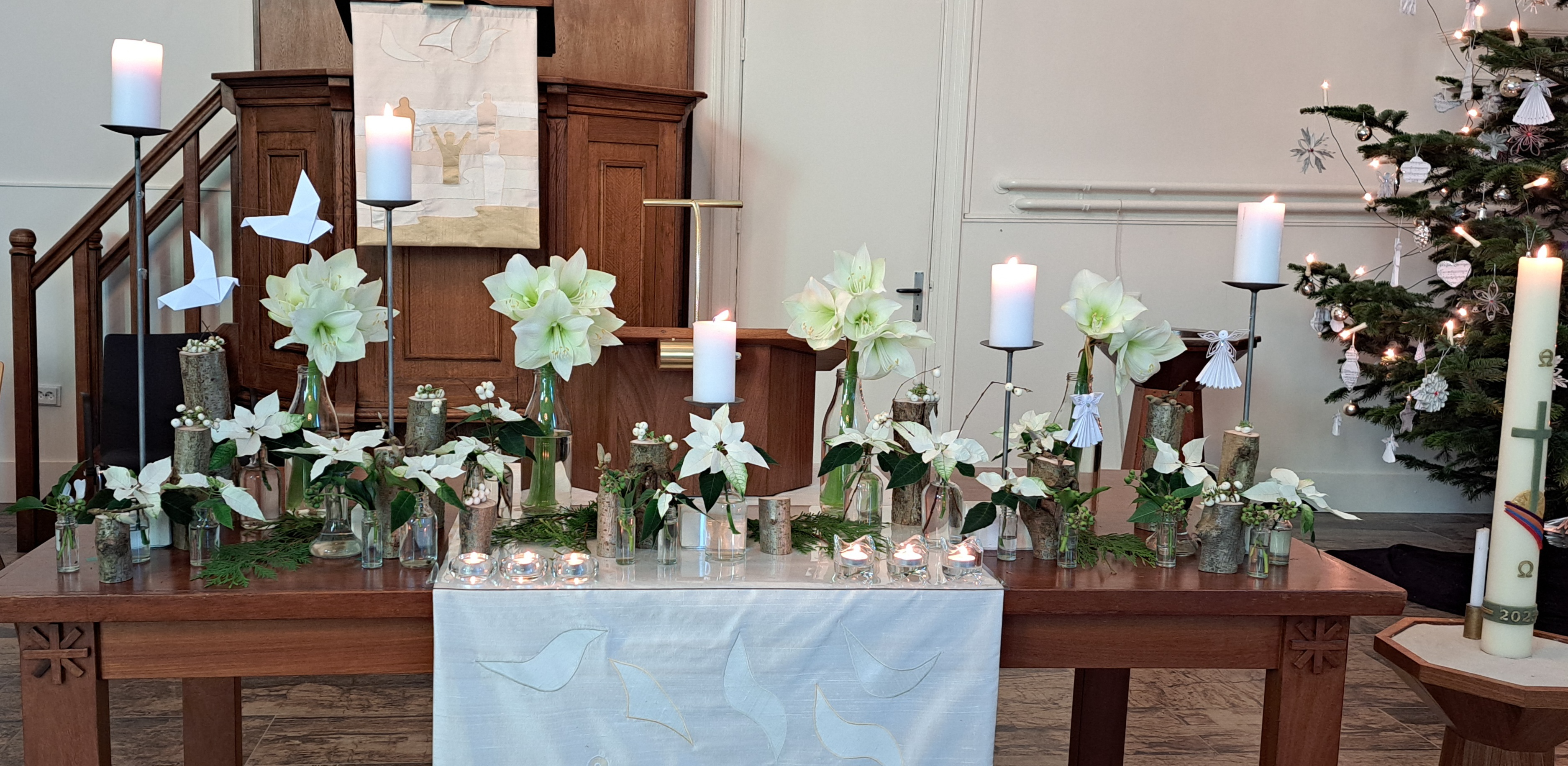 Midden voor de boomstronk en tussen de Alpha en de Omega staan twaalf witte rozen. Deze twaalf rozen staan voor de twaalf mensen uit onze gemeente die het afgelopen jaar zijn overleden. De witte rozen willen zeggen: vertrouw me. We vertrouwen er op dat God ook in de dood bij ons is.